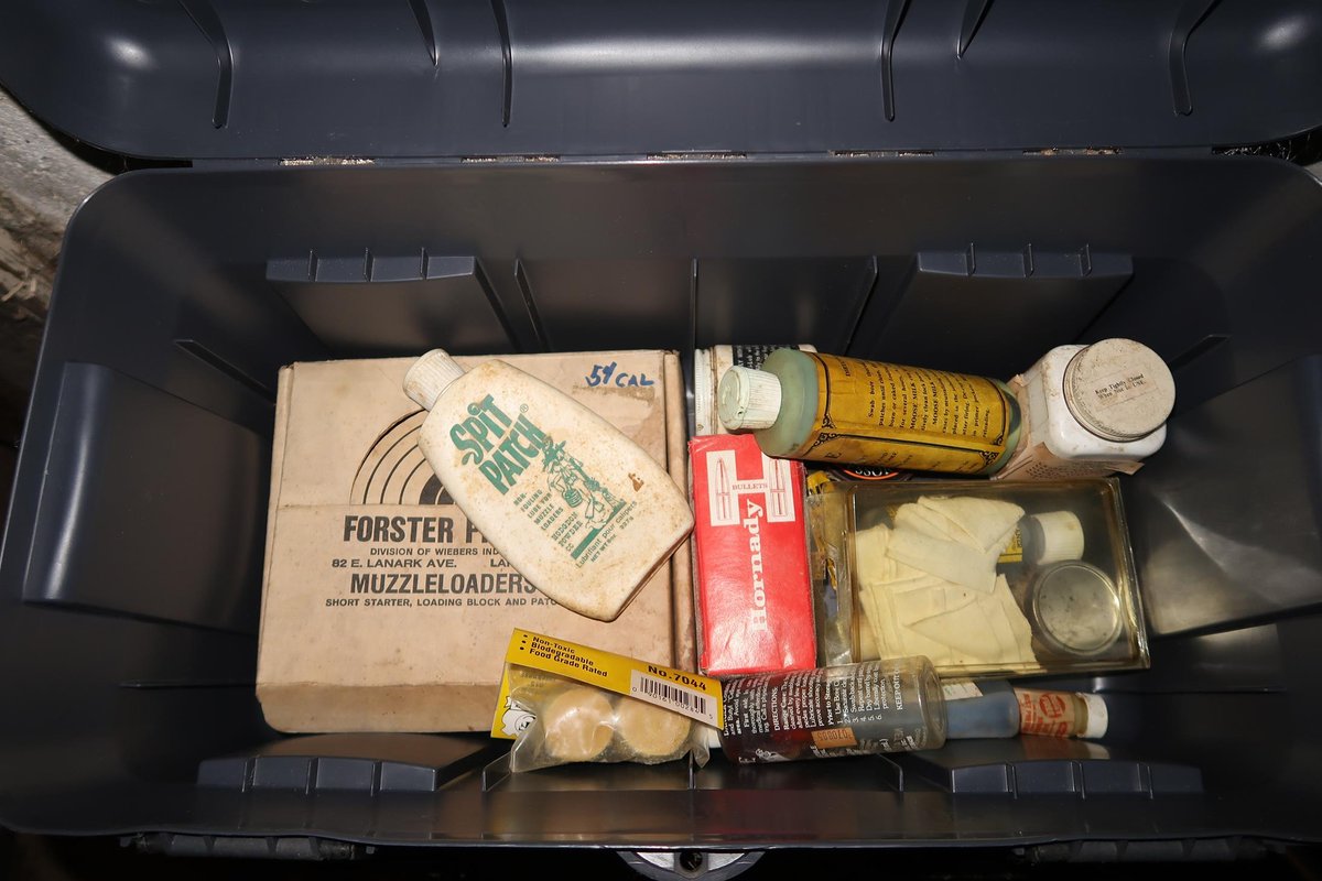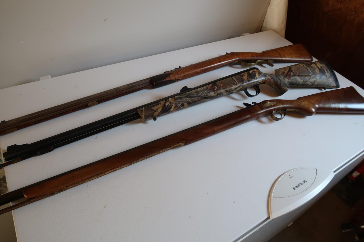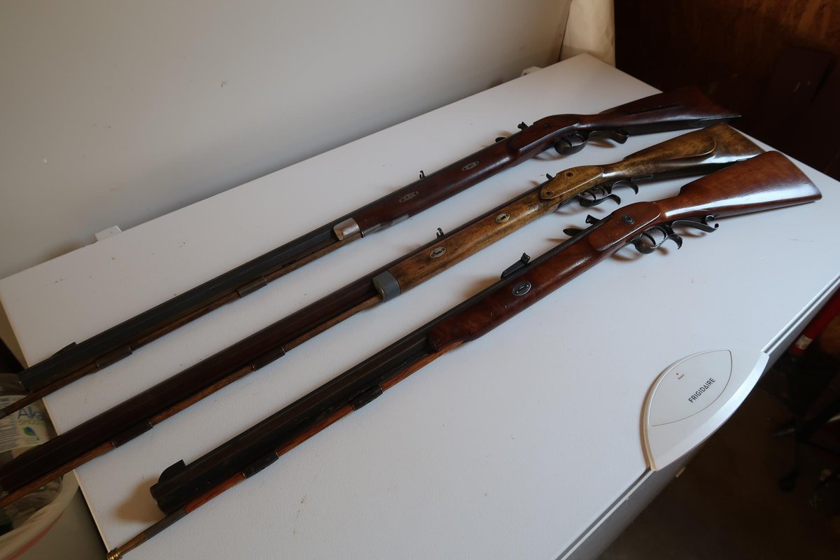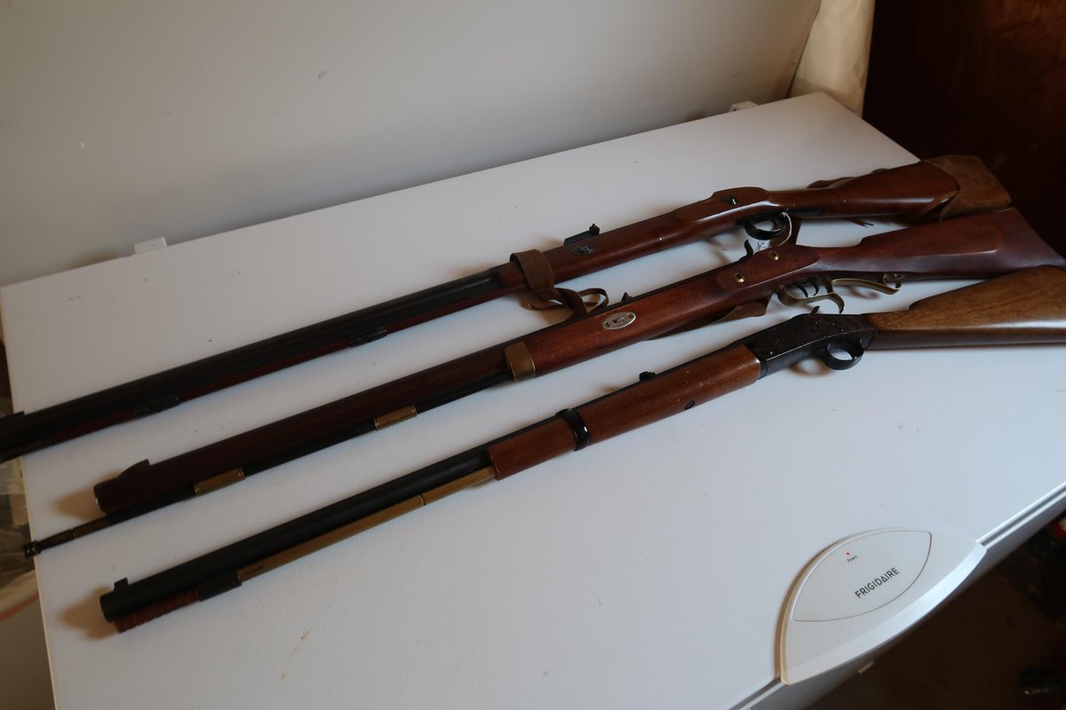 FIREARMS/REPRODUCTION MUZZLELOADERS: Misc. barrels, Dixie Gun Works .45 caliber flintlock, unmarked under hammer percussion, Connecticut Valley Arms .54 caliber percussion, unmarked flint lock, Thompson Center Arms .50 caliber flintlock, Jukar percussion, reproduction percussion long rifle, Thompson Center Arms .45 caliber percussion, Thompson Center Arms .50 caliber Pennsylvania Hunter, Connecticut Valley Arms .54 caliber Hawken, Harington and Richardson .58 caliber Huntsman, percussion rifle marked “Western”, Winchester X-150 .50 caliber, Made in Belgium flintlock, Connecticut Valley Arms .50 caliber Plainsman, Stone Mountain Arms .50 caliber Silver Eagle, unmarked .54 caliber percussion, Japan PR 469 percussion, Connecticut Valley Arms .50 caliber percussion, Hopkins and Allen .45 caliber percussion, Connecticut Valley Arms .50 caliber Plainsman, BPI Connecticut Valley Arms .50 caliber pistol, unmarked flintlock pistol, JC Higgin Model 20 12 gauge, Taiyo Junior .22 pellet gun, Crossman Pellgun. RECENTLY FOUND: 1851 Colt NAVY revolver reproduction made in Italy, Made in Belgium black powder pistol.
