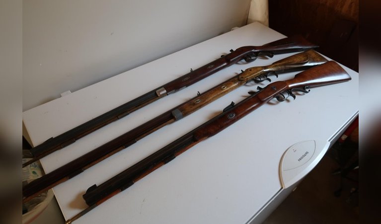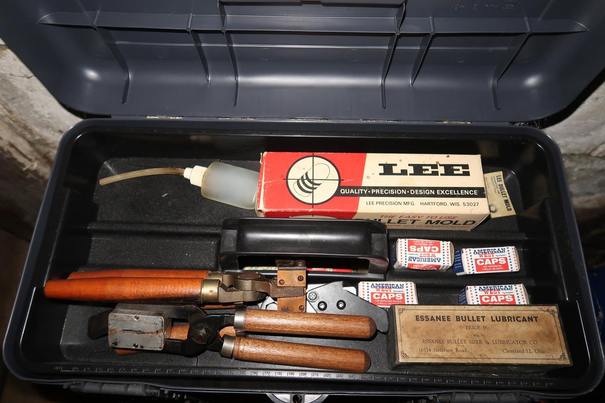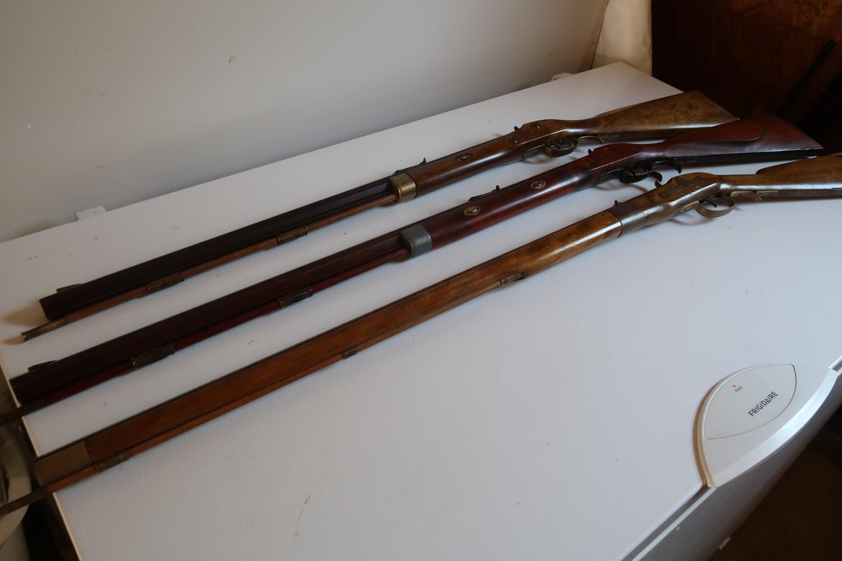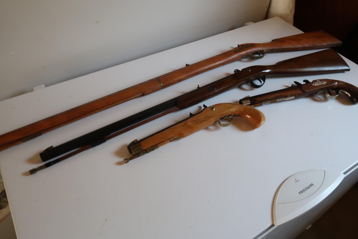 FIREARMS/REPRODUCTION MUZZLELOADERS: Misc. barrels, Dixie Gun Works .45 caliber flintlock, unmarked under hammer percussion, Connecticut Valley Arms .54 caliber percussion, unmarked flint lock, Thompson Center Arms .50 caliber flintlock, Jukar percussion, reproduction percussion long rifle, Thompson Center Arms .45 caliber percussion, Thompson Center Arms .50 caliber Pennsylvania Hunter, Connecticut Valley Arms .54 caliber Hawken, Harington and Richardson .58 caliber Huntsman, percussion rifle marked “Western”, Winchester X-150 .50 caliber, Made in Belgium flintlock, Connecticut Valley Arms .50 caliber Plainsman, Stone Mountain Arms .50 caliber Silver Eagle, unmarked .54 caliber percussion, Japan PR 469 percussion, Connecticut Valley Arms .50 caliber percussion, Hopkins and Allen .45 caliber percussion, Connecticut Valley Arms .50 caliber Plainsman, BPI Connecticut Valley Arms .50 caliber pistol, unmarked flintlock pistol, JC Higgin Model 20 12 gauge, Taiyo Junior .22 pellet gun, Crossman Pellgun. RECENTLY FOUND: 1851 Colt NAVY revolver reproduction made in Italy, Made in Belgium black powder pistol.